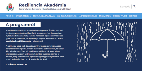 A Semmelweis Egyetem Magatartástudományi Intézet fejlesztésében elindult a Reziliencia Akadémia elnevezésű online tréning. A Reziliencia Akadémia honlapján olyan információk és gyakorlatok találhatók, amelyek segítségével a reziliencia – azaz a pszichés ellenállóképesség – fejleszthető.